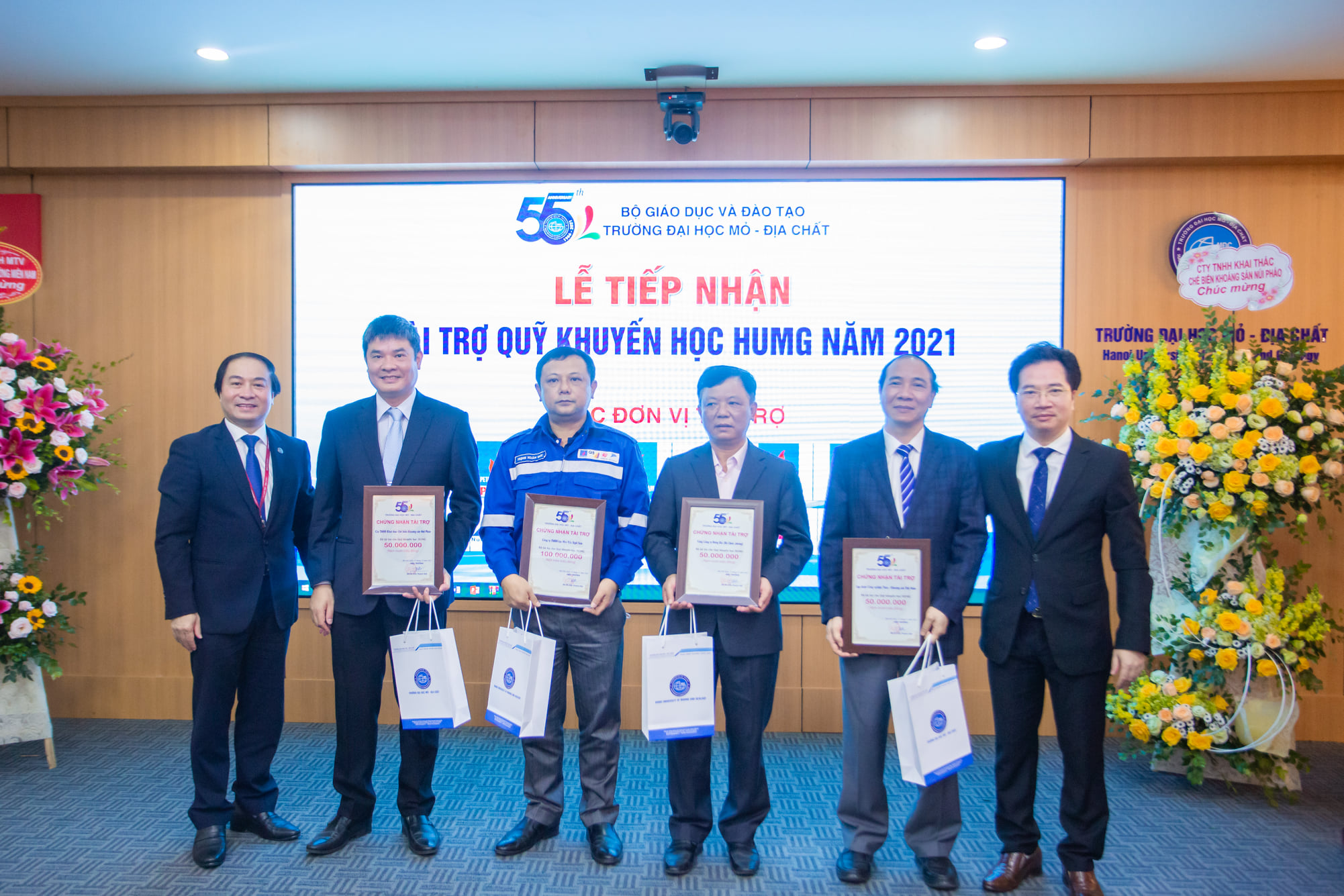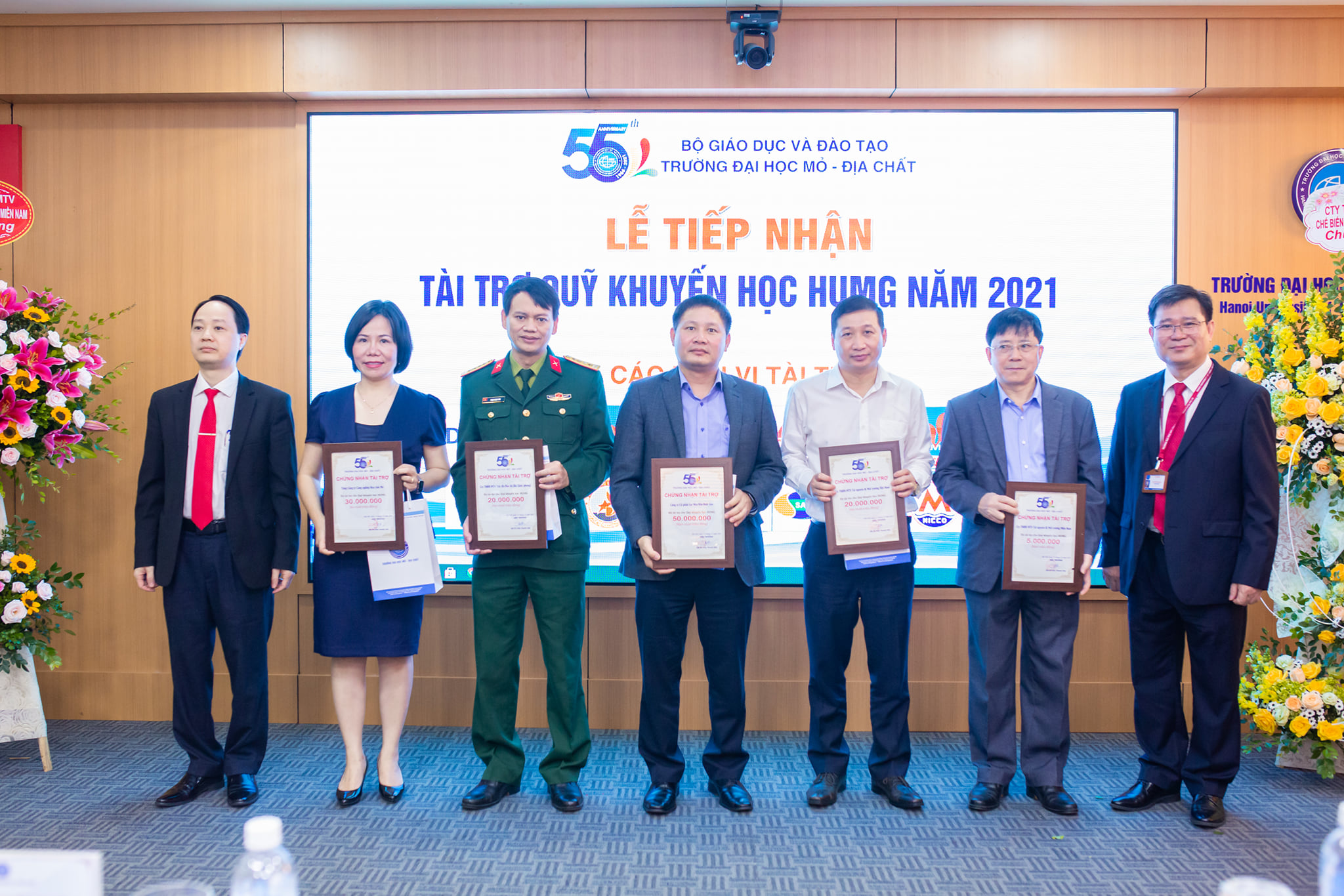 Để ghi nhận những đóng góp của các đơn vị, Lãnh đạo Trường Đại học Mỏ - Địa chất đã trao giấy chứng nhận và tặng quà lưu niệm thay lời tri ân tới các đơn vị vì đã ủng hộ cho Quỹ khuyến học HUMG. Cuối chương trình, PGS.TS Triệu Hùng Trường – Trưởng Ban khuyến học đã lên tiếp nhận tài trợ của các đơn vị.
