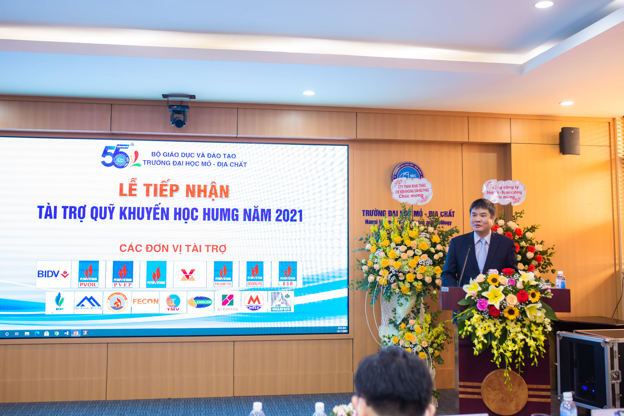 GS.TS Trần Thanh Hải – Hiệu trưởng phát biểu trân trọng cảm ơn các tổ chức và cá nhân đã ủng hộ cho Quỹ khuyến học HUMG. Đặc biệt là các đơn vị thường xuyên ủng hộ Quỹ như Tập đoàn Than Khoáng sản Việt Nam và các đơn vị thành viên, Tập đoàn Dầu khí Quốc gia Việt Nam và các đơn vị thành viên, Ngân hàng BIDV, Tổng công ty Đông Bắc, Tổng cục Bản đồ Bộ Tổng tham mưu, Công ty TNHH Tài nguyên và Môi trường Việt Nam, Công ty cổ phần Fecon, Công ty TNHH Khai thác chế biến khoáng sản Núi Pháo, Công ty TNHH Lọc hóa dầu Nghi Sơn, Lọc Hóa dầu Bình Sơn và rất nhiều đối tác khác. Đồng thời, đồng chí mong muốn trong thời gian tới Quỹ khuyến học HUMG tiếp tục nhận được sự quan tâm, đồng hành và ủng hộ của các đơn vị để nhiều sinh viên được nhận hỗ trợ từ Quỹ khuyến học HUMG hơn nữa. Thay mặt Ban Khuyến học, đồng chí cam kết sử dụng Quỹ khuyến học HUMG theo đúng theo mục đích và tôn chỉ đã đề ra và đúng quy định của pháp luật với tinh thần Tất cả vì sinh viên.